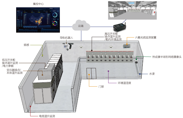 配置开关柜无线测温系统,用于监测开关 柜高压设备接点温度加强对母排温度监视 以防止母排过热烧毁相邻的绝缘部件。